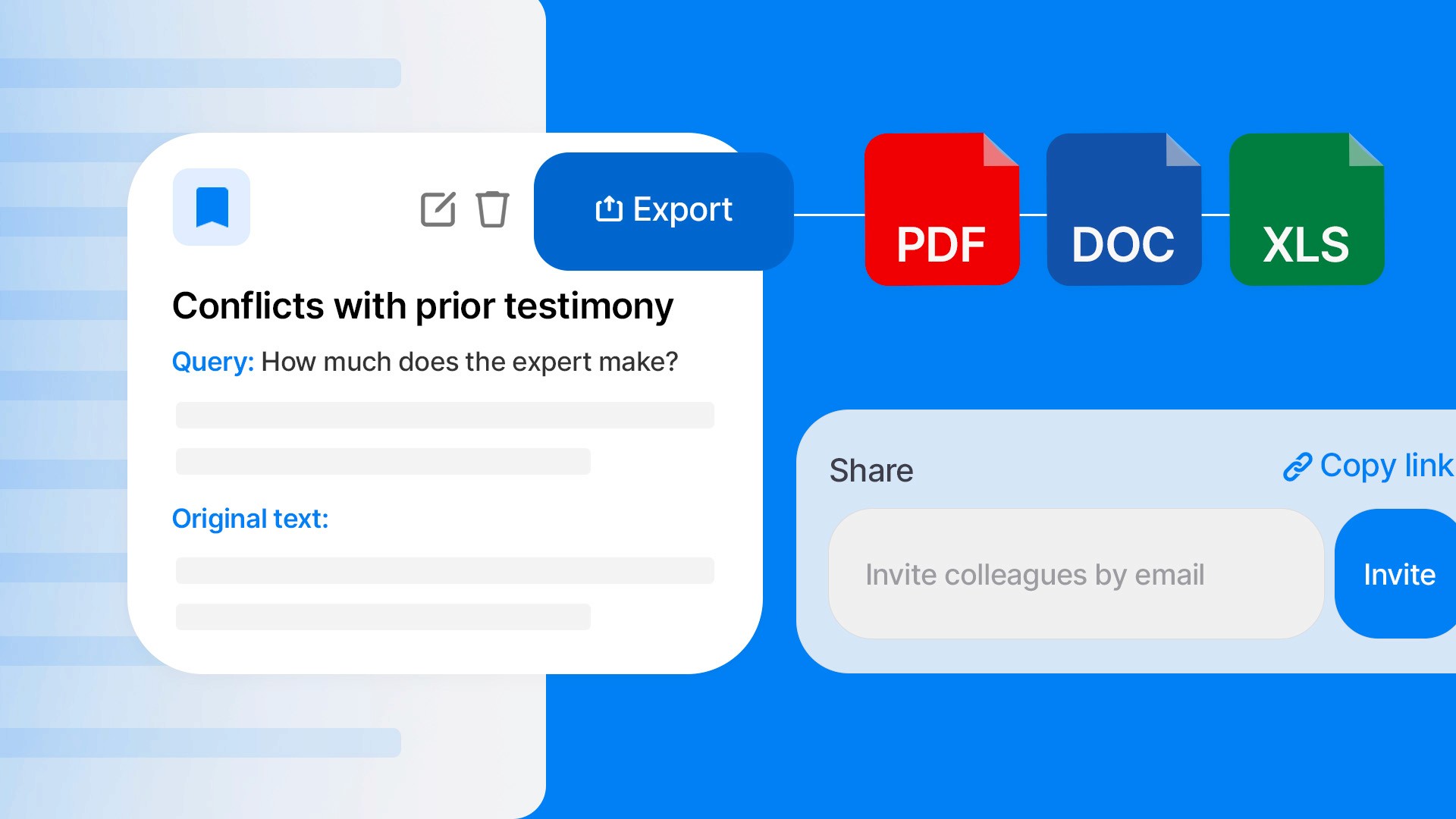 Yes. You can share direct links to workspaces, export summaries and analyses to Word or PDF, and generate page-line citations for immediate verification. Everything Newcase produces is designed to be court ready and shareable with colleagues and clients.